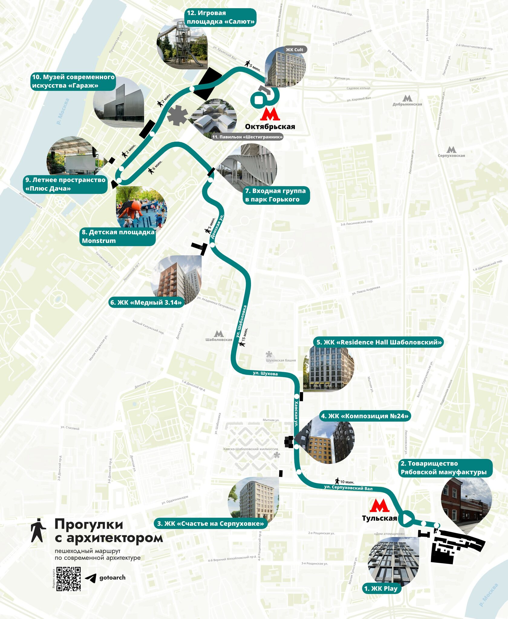 Маршрут проходит от станции метро Тульская до Октябрьской. Мы увидим несколько жилых домов, пример реорганизации промышленной территории и благоустройства общественных пространств, а также поговорим о музейной архитектуре Парка Горького.